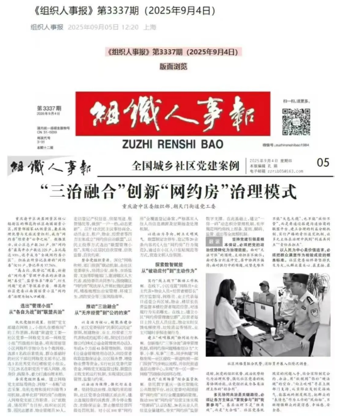近日,我区《“三治融合”创新“网约房”治理模式》经验做法入选第二届全国城乡社区党建案例,并在《组织人事报》“全国城乡社区党建案例”专栏刊登,全文如下: