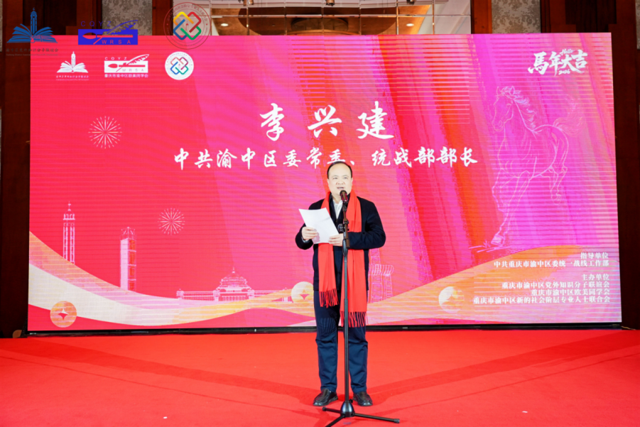 活动中,中共渝中区委常委、区委统战部部长李兴建致辞,向各位会员朋友致以新春祝福,对区知联会、区欧美同学会和区新专联2025年工作给予充分肯定,对2026年工作提出希望,他强调要进一步加强交流合作,凝聚智慧力量,在服务渝中高质量发展中展现更大作为:一是坚守爱国主义精神,紧密团结在党中央周围,把个人理想融入国家发展大局,为中华民族伟大复兴贡献智慧和力量。二是主动顺应发展潮流,紧扣“十五五”开局目标,顺势而为,发展好自身事业、积极建言献策、讲好中国故事,展现统战团体的担当和作为。三是敢于投身创新创造,紧跟科技革命与产业变革趋势,主动拥抱数字化、提升专业能力,让创新活力在渝中充分涌流。