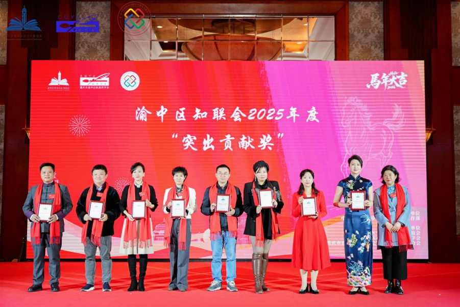 年会设置了“突出贡献奖”颁奖仪式,表彰在过去一年中立足本职、发挥优势、积极作为的优秀会员代表。随后进行的节目表演精彩纷呈,充分展现了三个团体会员们的多才多艺和昂扬风貌。区新专联带来的《歌曲串烧》活力四射,拉开演出序幕;区欧美同学会的多语种朗诵《留学报国聚渝中 万语同音赴新程》,以中、英、日等多国语言抒发留学报国的赤子情怀;区知联会演奏的歌曲《万疆》,深情表达对祖国山河的热爱;区新专联的双排排箫演奏《雪绒花》《山楂树》,悠扬婉转,别具一格;区知联会讲述的《扎根渝中,创业同行》——在渝中创业20年的小故事,真情流露,感人至深;区欧美同学会的舞蹈《山河故人》,以优美舞姿,触摸山河的脉搏。区新专联的朗诵《我是渝中新阶人》,铿锵有力,展现新阶层人士的责任担当。最后,区知联会演唱的《我和我的祖国》将现场气氛推向高潮。