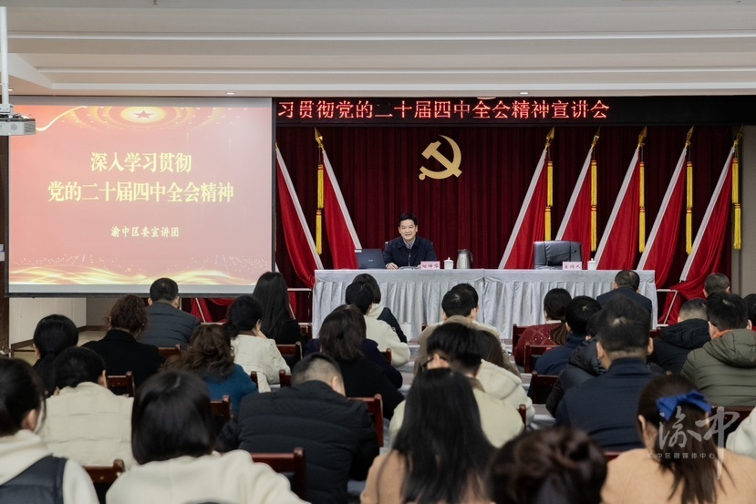 11月25日,解放碑街道召开学习贯彻党的二十届四中全会精神宣讲会。渝中区委宣讲团成员、区委办公室主任阳坤华作宣讲报告。