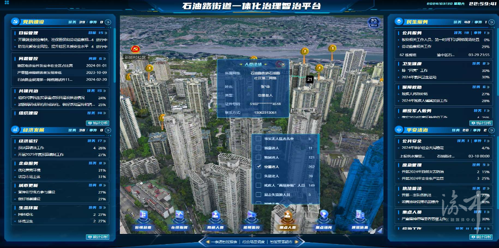 此外,渝中区在全市率先实现L2级实景地图全覆盖,在石油路街道试点L3级精细化呈现,完成街道、社区、网格、楼栋、人员等11.6万条信息在立体空间落图,实现人、房、地、事、物等信息一屏立体掌控,优化了城市治理模式,提升了治理精细程度。